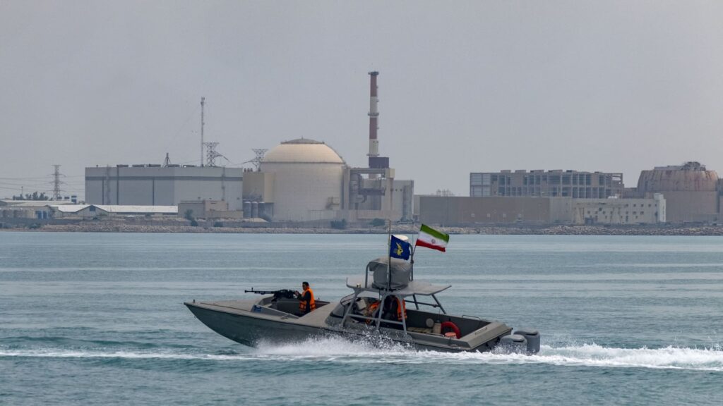 La lancha rápida del guardia revolucionario islámico navega a lo largo del Golfo Pérsico el 29 de abril de 2024 durante un desfile del Cuerpo de Marines del IRGC cerca de la planta de energía nuclear en la ciudad de Bussia, la ciudad de Bussia, la ciudad de Bussia, el sur de Irán.