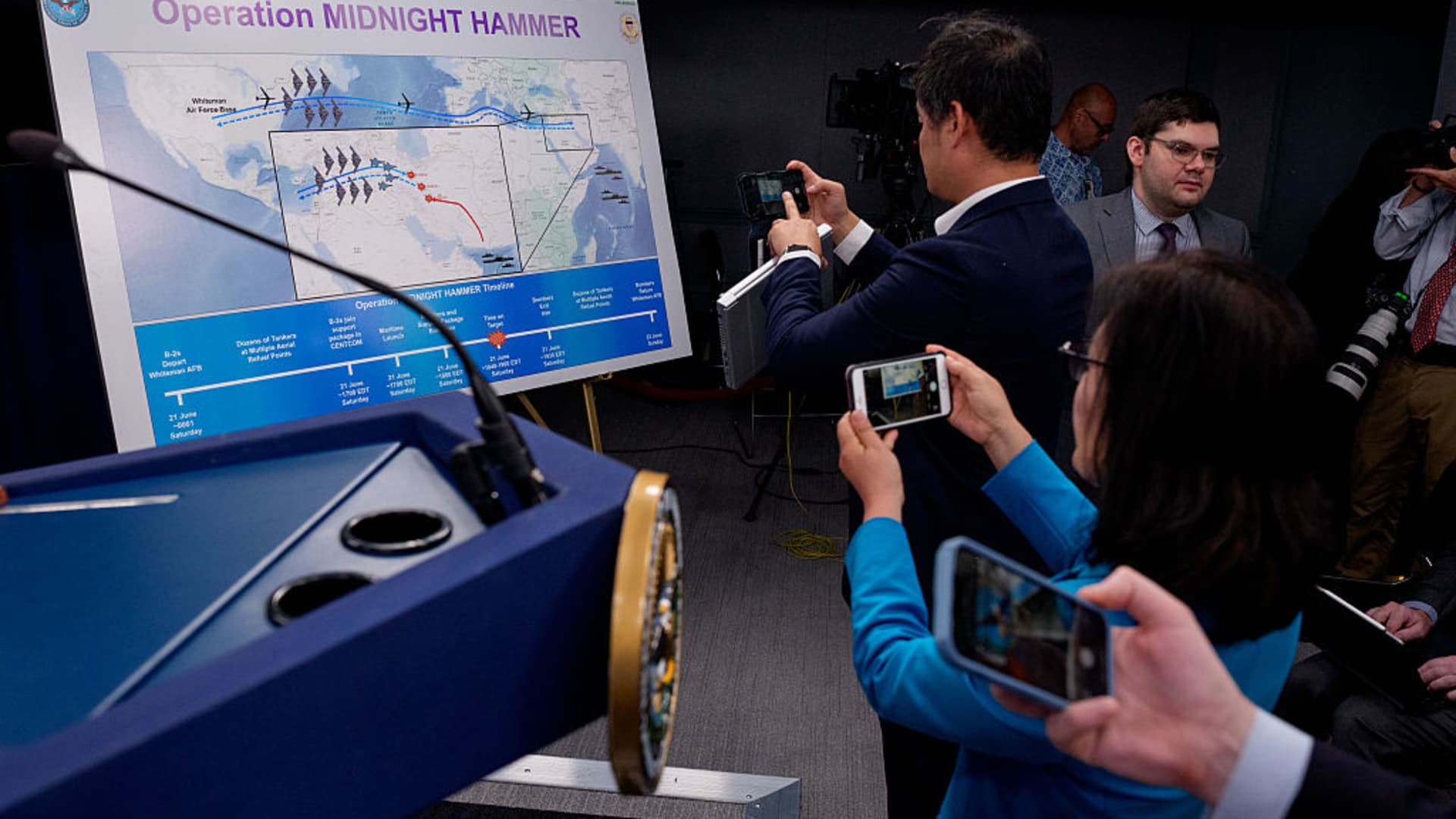 Los reporteros filmarán el calendario operativo de la huelga del Pentágono en Irán celebrada en Arlington, Virginia, EE. UU., El 22 de junio de 2025